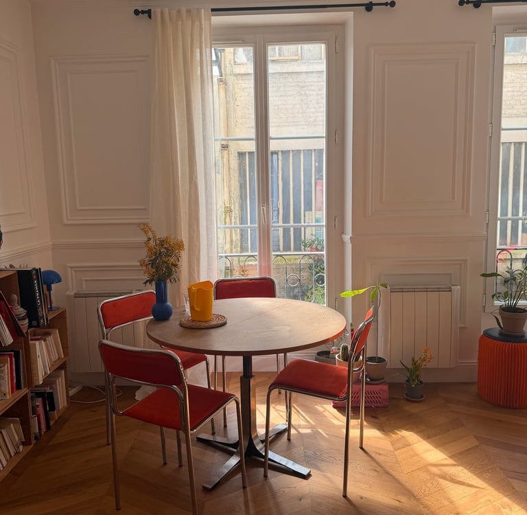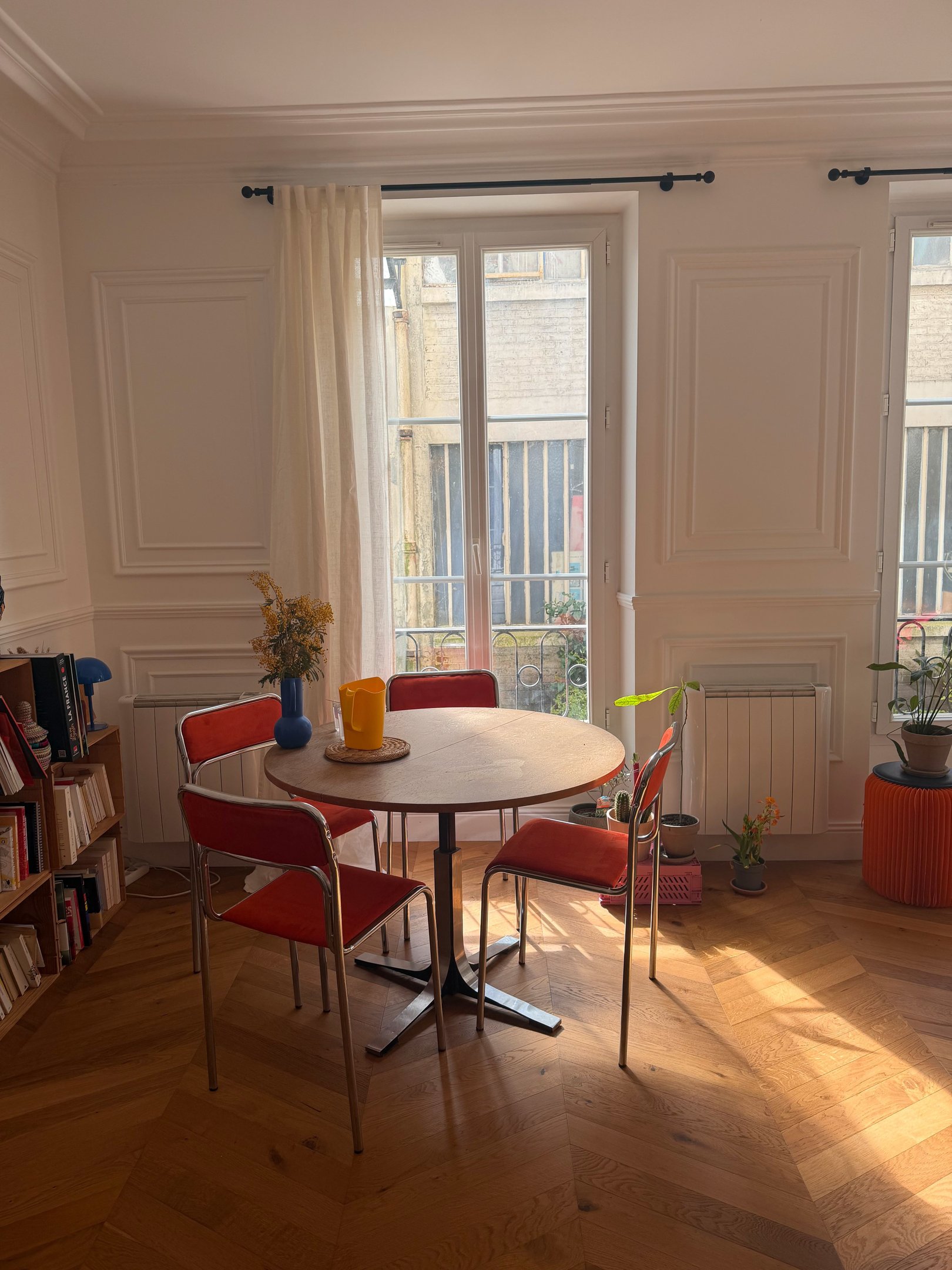 Avec seulement quelques pièces fortes, l’espace de Chloé a gagné en caractère. La salle à manger devient un véritable lieu de vie, chaleureux et affirmé, où le design dialogue avec l’architecture.