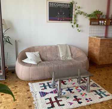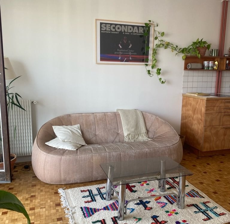 Pour Juliette V, l'aménagement de son coin salon est un véritable hommage aux années 70. La pièce maîtresse est une table basse chromée tubulaire au design emblématique de cette époque, qui apporte une touche de modernité et d'élégance. Autour de cette table, le canapé chiné de la marque Cinna, avec ses lignes douces et ses matériaux chaleureux, crée une atmosphère accueillante et conviviale. Pour compléter cet agencement, quelques éléments de décoration vintage et des plantes d'intérieur viennent harmoniser l'ensemble, rendant cet espace idéal pour se détendre ou recevoir des amis. Ce coin salon est à la fois stylé et fonctionnel, reflet du goût raffiné de Juliette V.