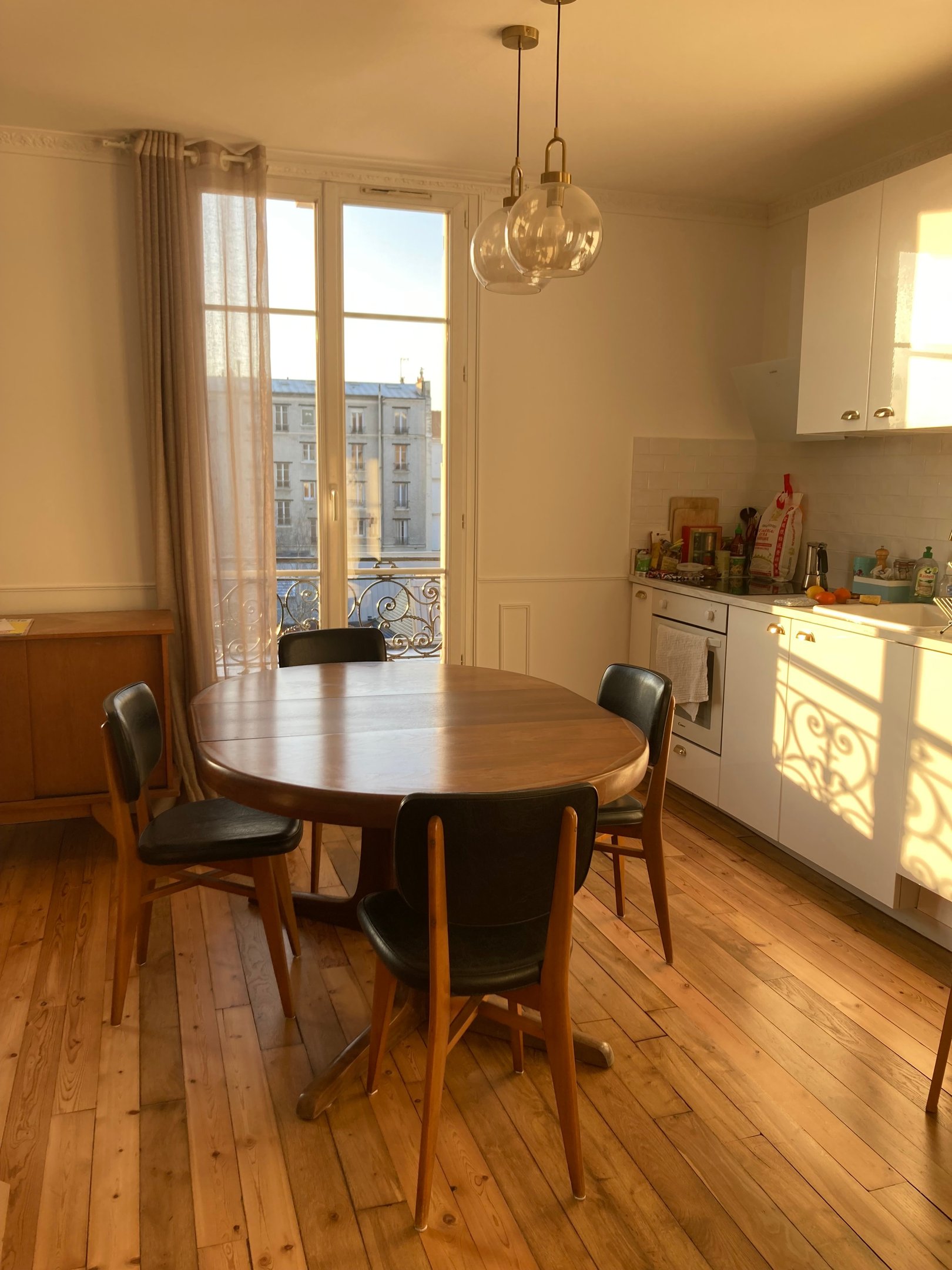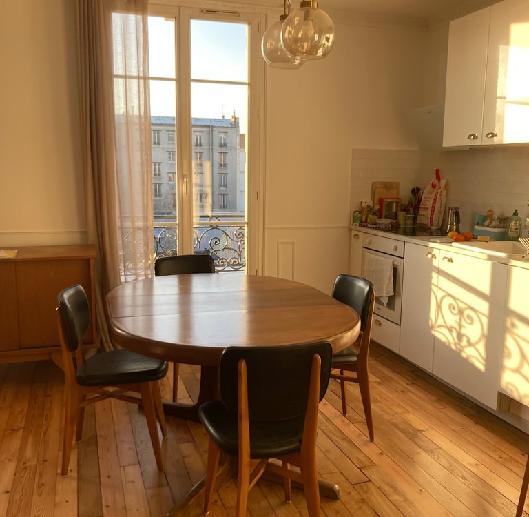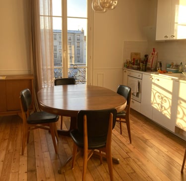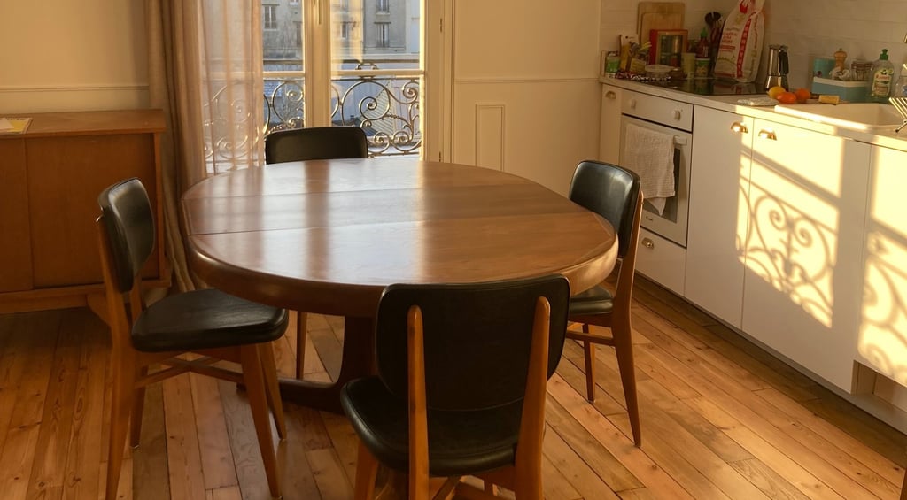 Dans cette salle à manger épurée, le bois clair est à l'honneur. La table ovale, centre de l'espace, offre un lieu de partage convivial. Les chaises au design simple et élégant complètent l'ensemble. Un buffet bas discret assure le rangement. La lumière naturelle baigne la pièce, créant une atmosphère chaleureuse et invitante. Quelques touches de décoration personnalisent l'espace. Un lieu où simplicité rime avec fonctionnalité.
