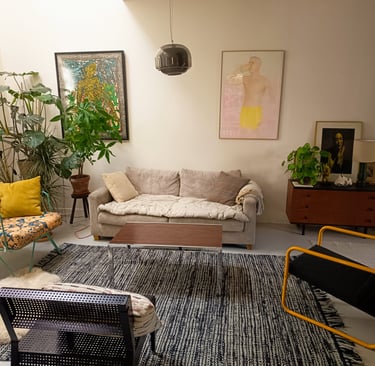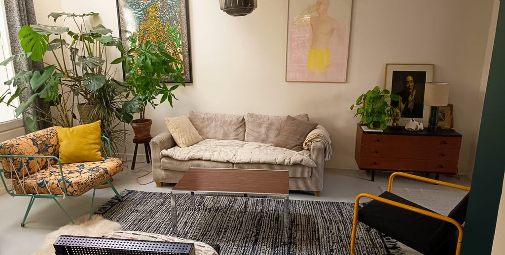 Pour Mikael C, l’ameublement de son espace de vie a pris la forme d’un salon chaleureux où se mêlent influences éclectiques et confort moderne. Le point fort de la pièce réside dans la sélection d’assises de caractère : un fauteuil aux lignes graphiques et colorées, une chaise basse au design affirmé et un canapé vintage au charme discret. Chassor a accompagné Mikael dans la recherche de ces pièces uniques, capables de dialoguer entre elles tout en donnant du relief à l’ensemble.